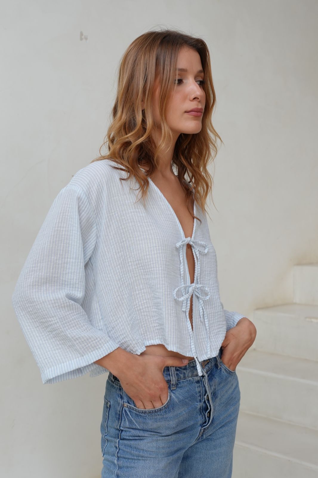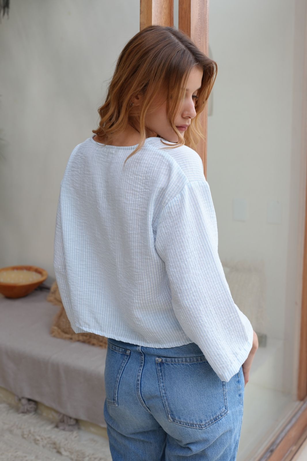 Blusa azul con rayas blancas manga midi ancha con escote en V, en tela poliéster, ajustable al frente con dos delicados lazos del mismo tejido.