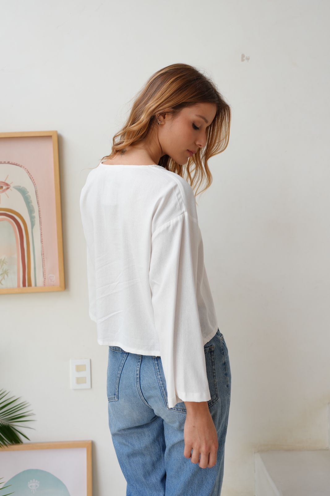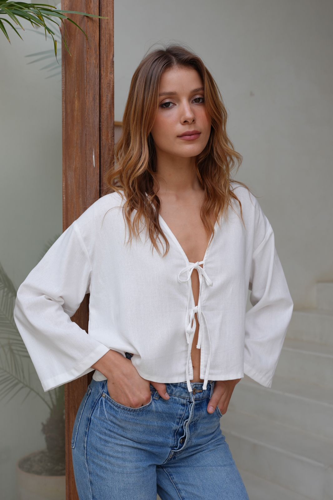 Blusa blanca manga midi ancha con escote en V, en tela rayón tipo lino, ajustable al frente con dos delicados lazos del mismo tejido.