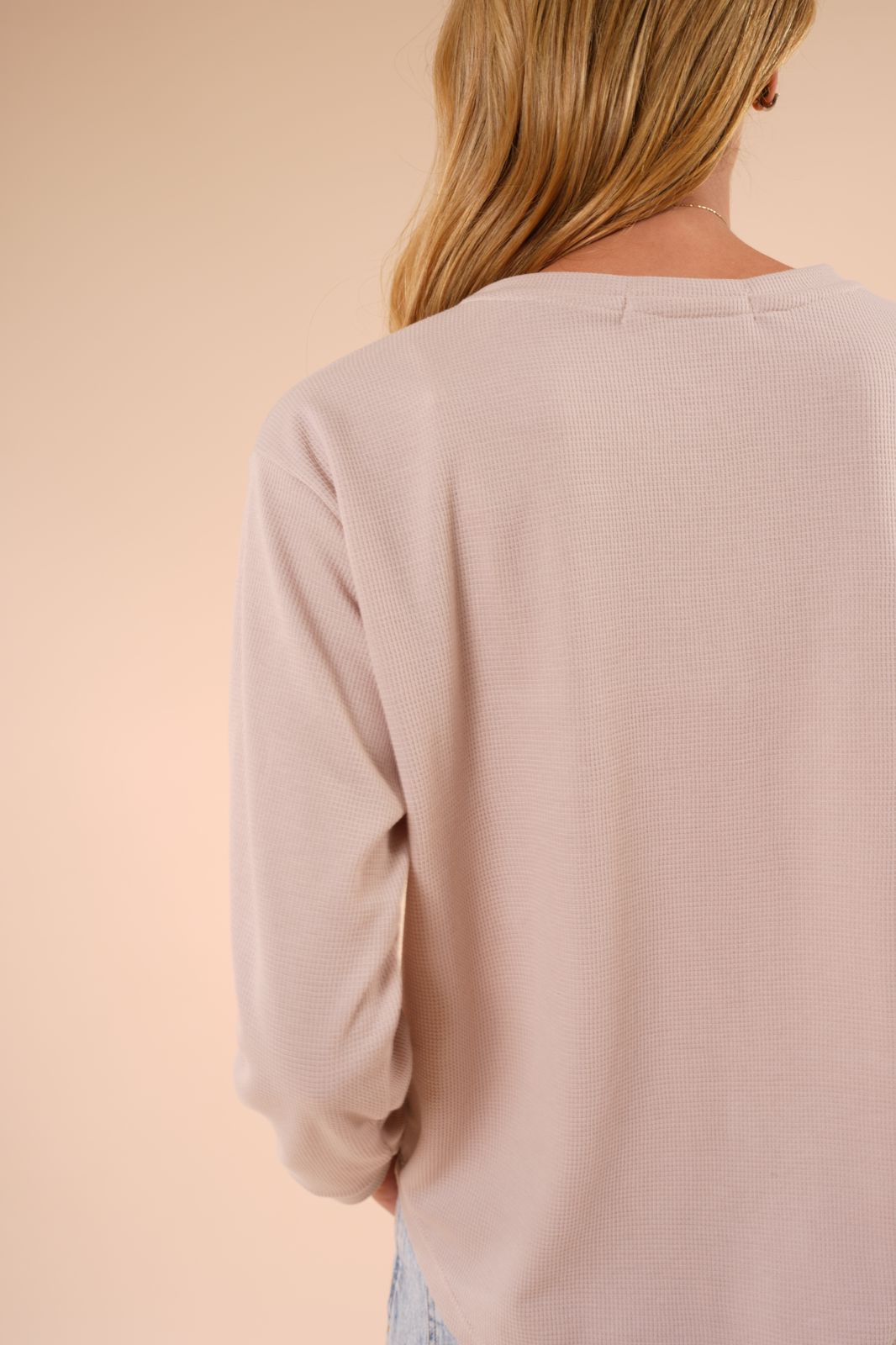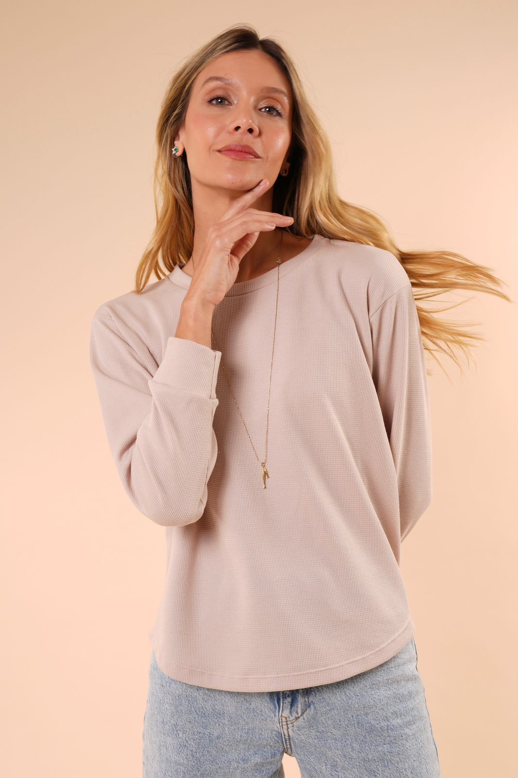 Su diseño de silueta relajada con cuello redondo y mangas largas ofrece comodidad y movimiento. En tela miniwafer 100% algodón, de estilo casual y cómodo.