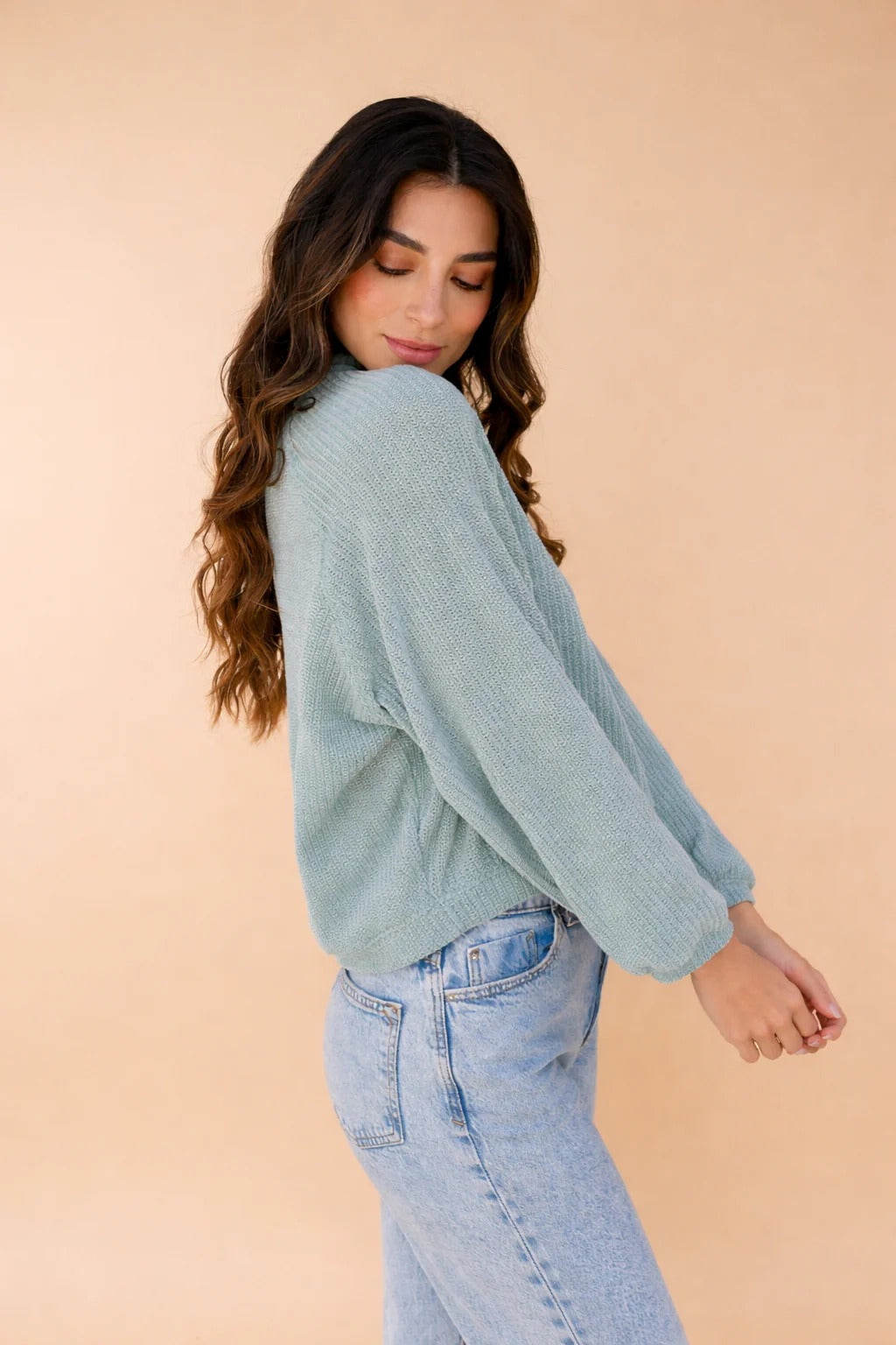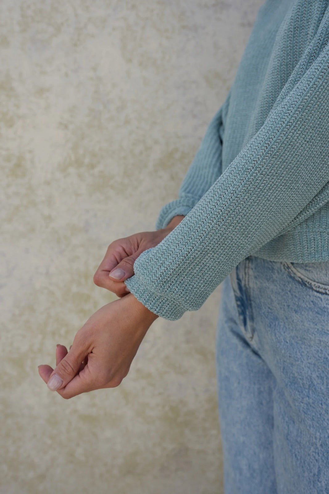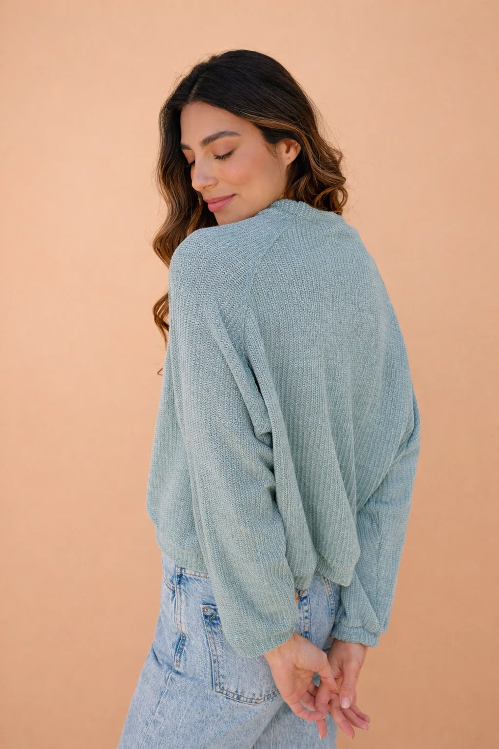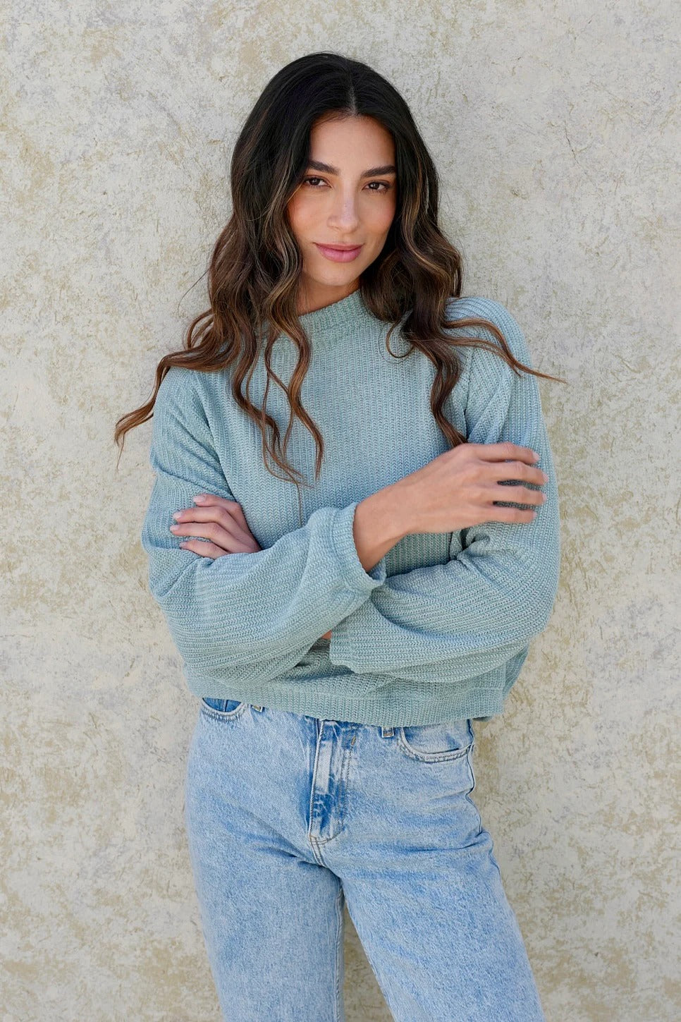 Sweater de tejido liviano en tono verde suave, inspirado en la calma y la naturalidad. Su diseño de silueta relajada con cuello redondo y mangas largas ofrece comodidad y movimiento