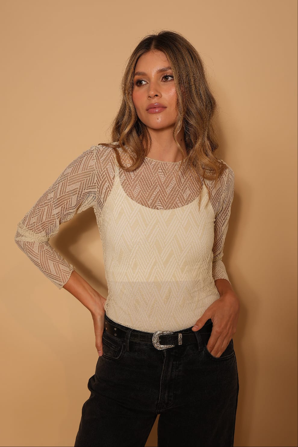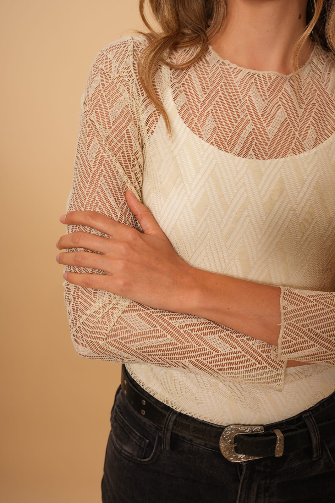 Buzo Tiny, una prenda delicada y versátil que combina la sutileza del encaje con un diseño moderno y femenino. Perfecto para elevar tus looks casuales con un toque de elegancia.