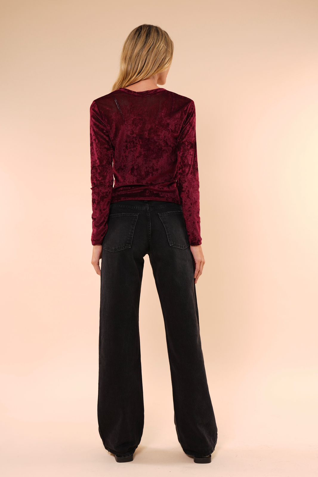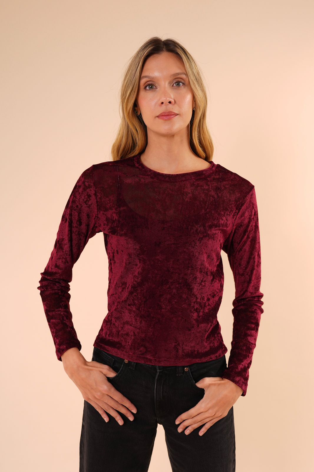 Buzo manga larga efecto velvet. Prenda básica y sofisticada. Esta, brillo sutil y una sensación ultra cómoda. Su silueta ajustada realza el cuerpo sin marcar de más, perfecta para usar sola o como capa base.
