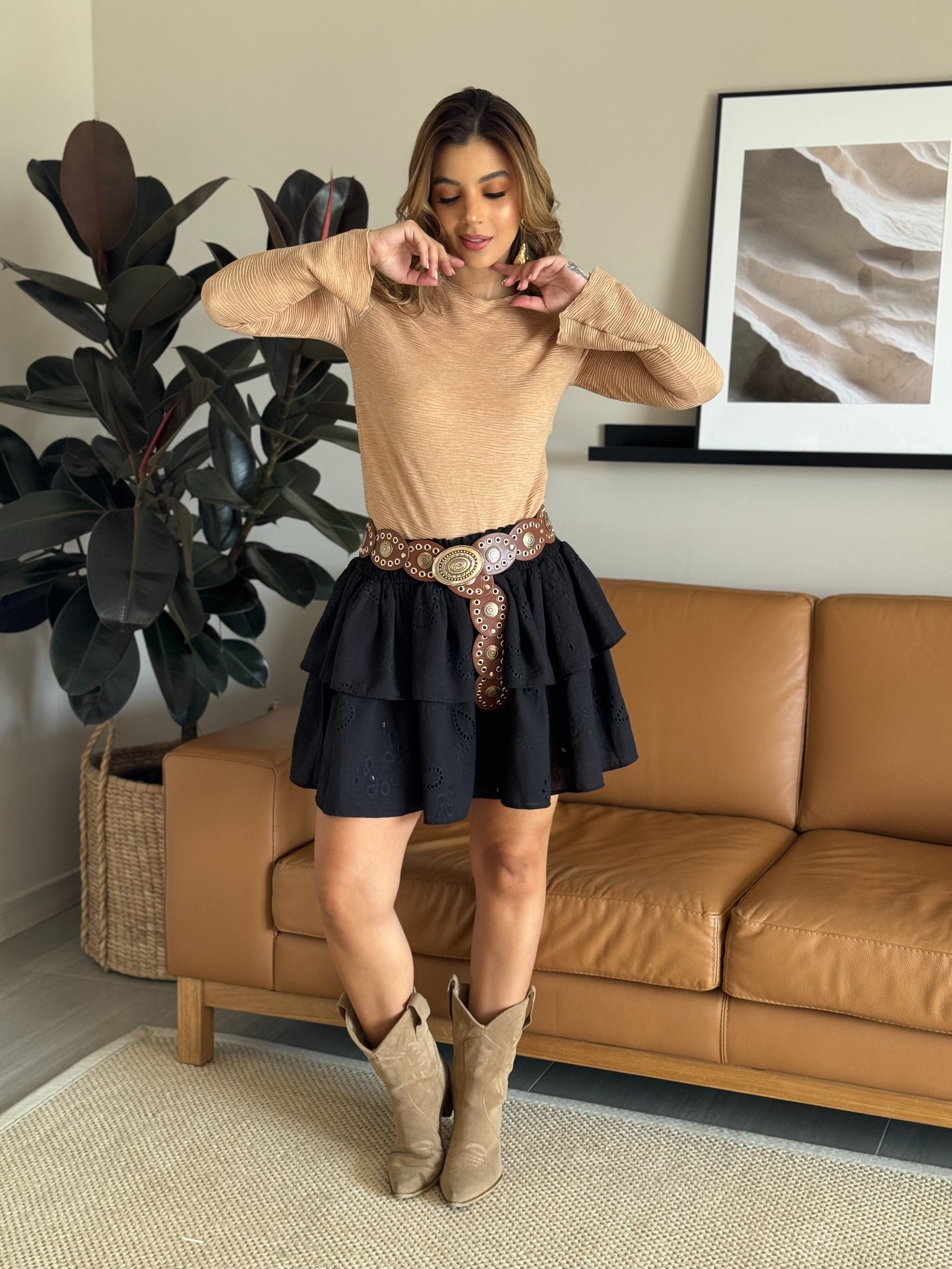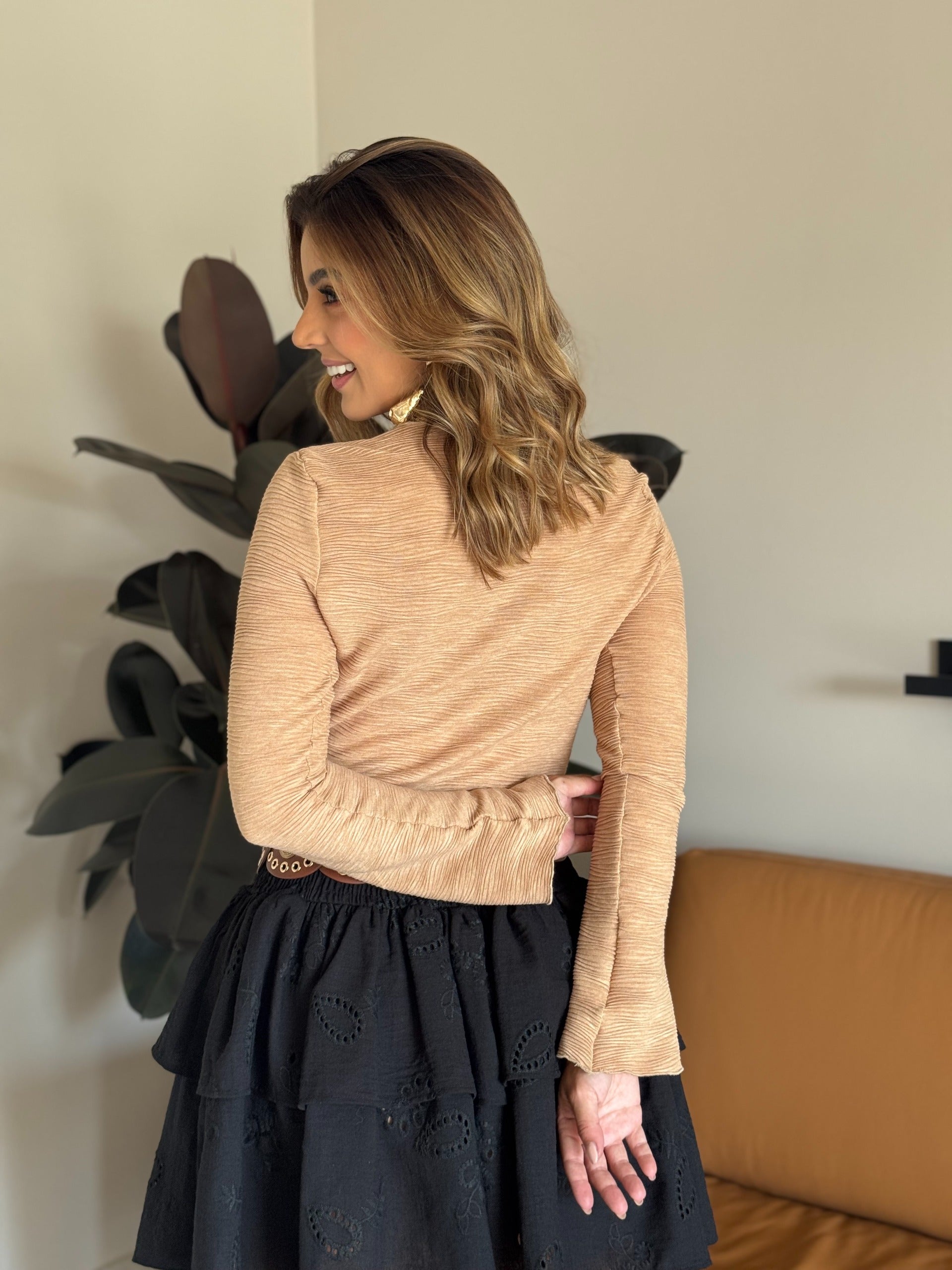 Atrévete a resaltar con el Camibuzo Valery, una prenda versátil que combina lo mejor del estilo boho con un diseño moderno y diferente. Su tela estilo mesh con efecto trillado se ajusta suavemente al cuerpo, brindando estructura sin transparencias y sin perder comodidad. Las mangas campana y el cuello redondo aportan un aire femenino y elegante, ideal para elevar cualquier outfit.