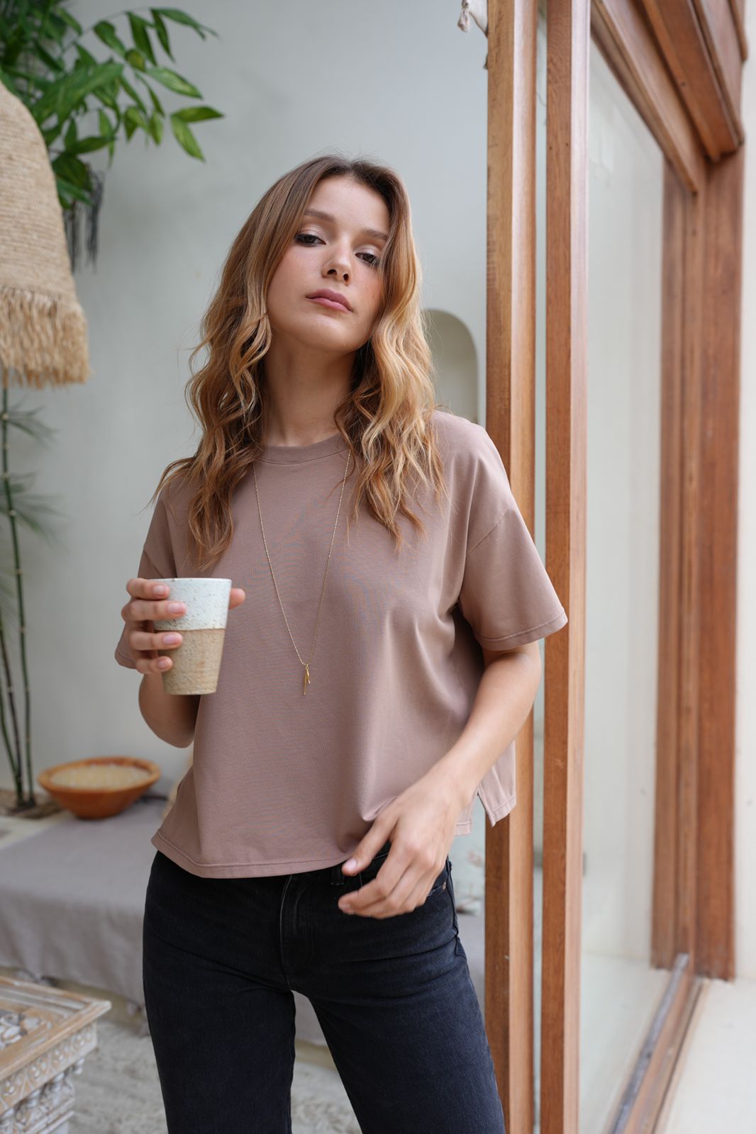Una básica que representa tú esencia. Color mocca, confeccionada en algodón suave. La prenda es de silueta amplia.
