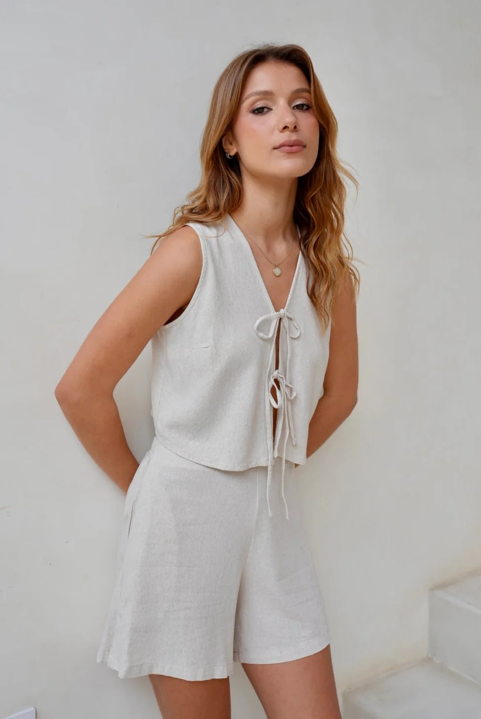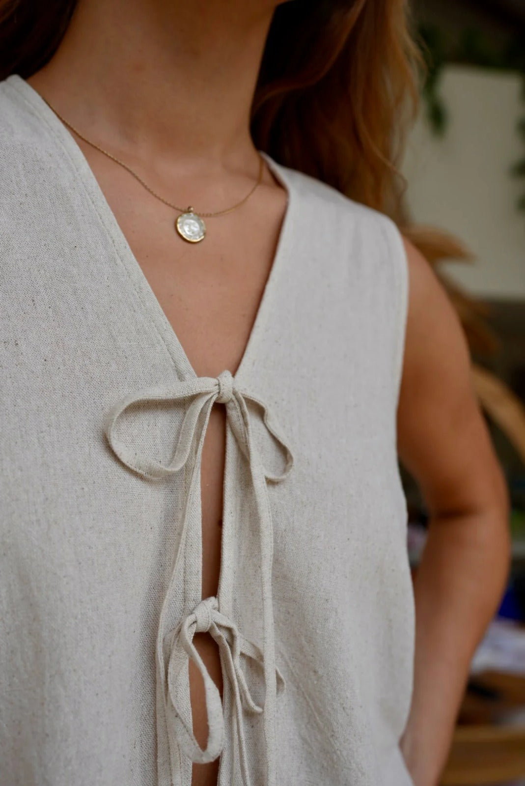 Chalecos que elevan tu estilo. En color arena, manga sisa, con escote en V, en tela rayón, ajustable al frente con dos delicados lazos del mismo tejido.
