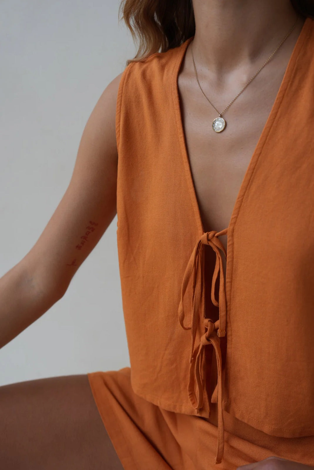 Chalecos que elevan tu estilo. En color naranja, manga sisa, con escote en V, en tela rayón, ajustable al frente con dos delicados lazos del mismo tejido.