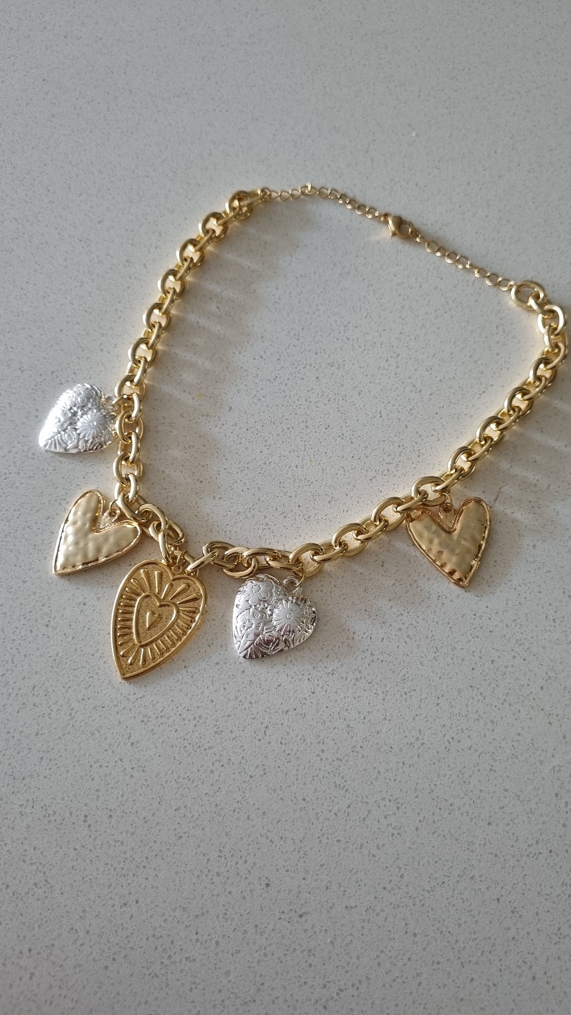 Un diseño lleno de carácter y romanticismo. Este collar combina corazones dorados y plateados en una cadena gruesa que se roba todas las miradas. Perfecto para elevar looks neutros o prendas de líneas sencillas, como blusas lisas o vestidos sin estampados.
