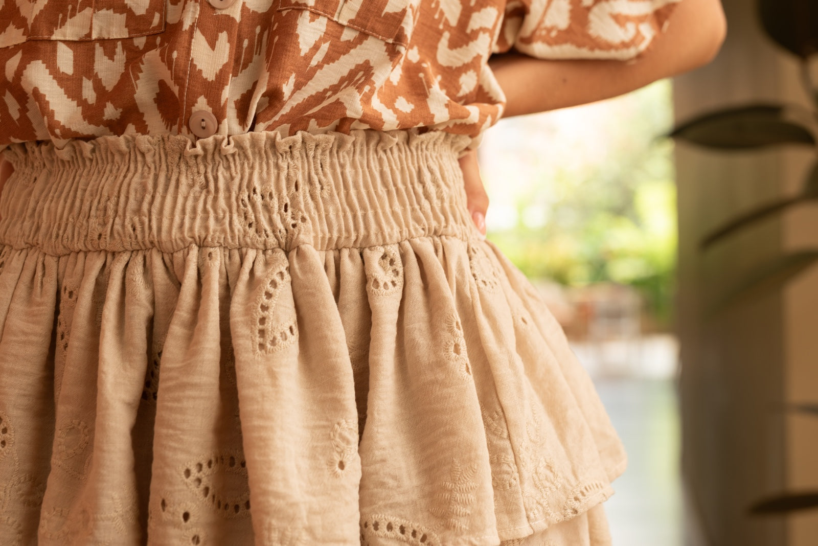 Tiene resorte en la cintura que se ajusta a tu silueta y es fabricada en ojalillo que le da ese toque romántico a tú look.
