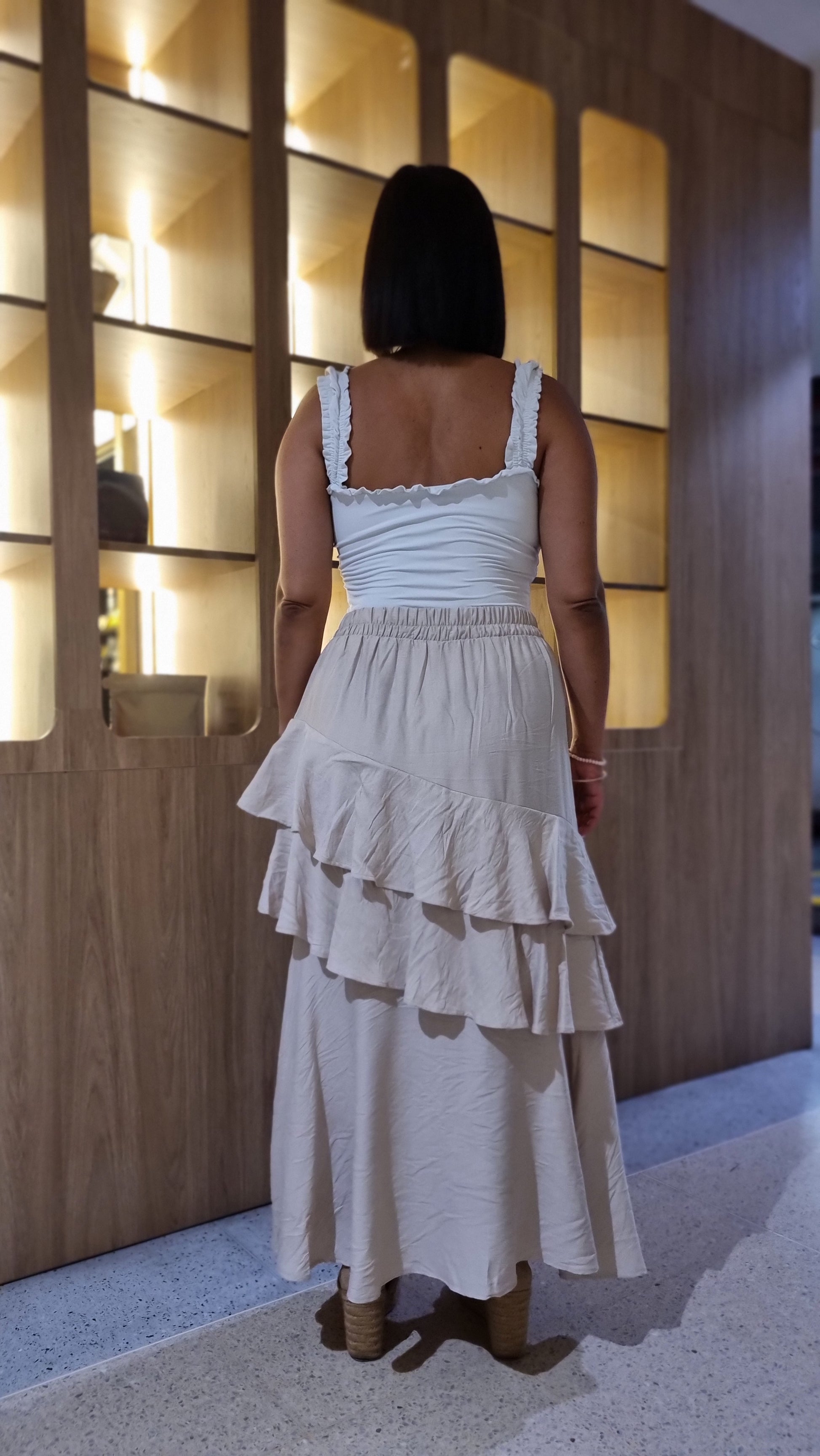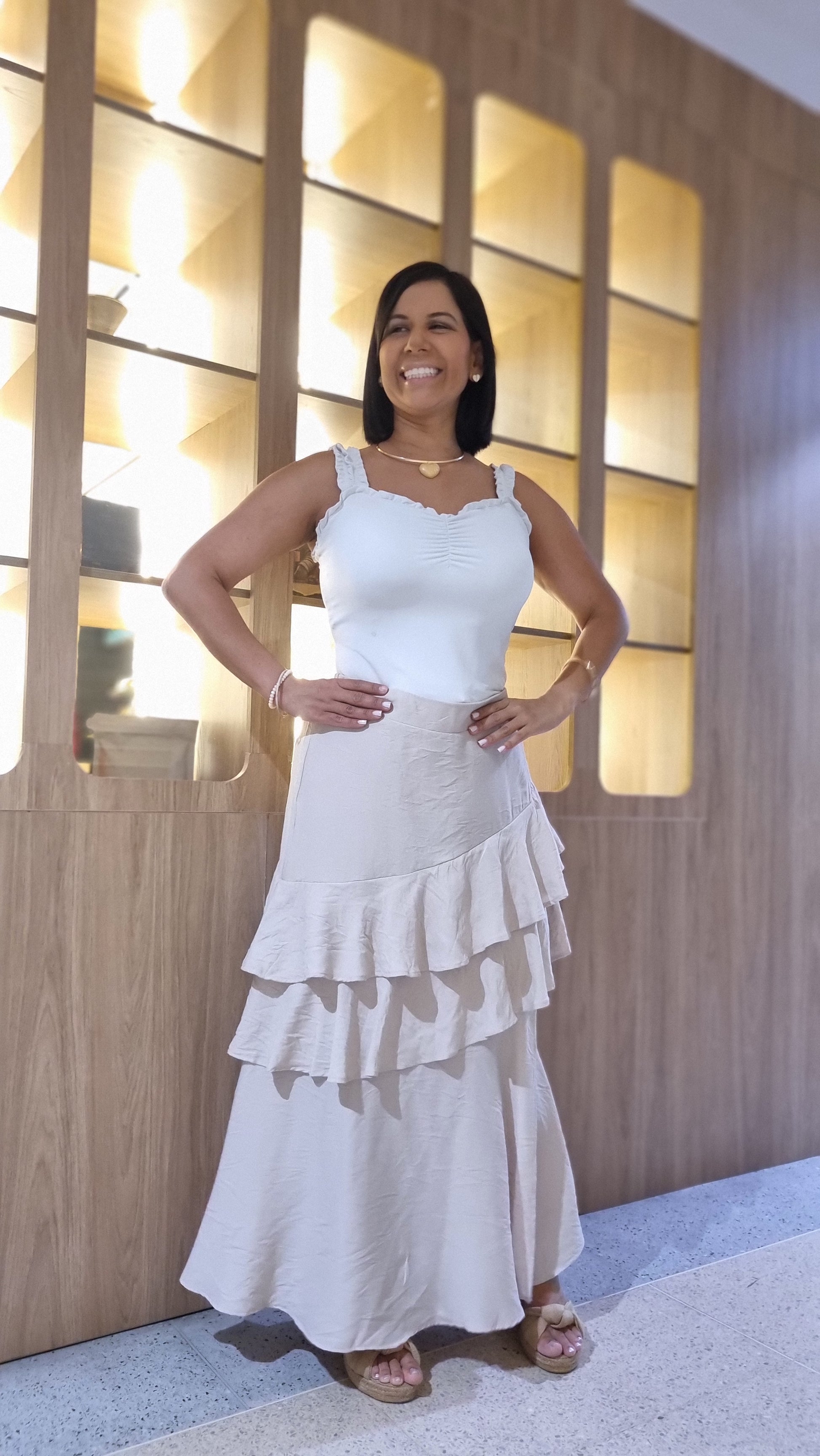 Atrévete a destacar con esta falda de boleros en color arena que combina estilo, frescura y movimiento. Confeccionada en tejido suave de rayón con nylon, Su diseño fluido y sutil hacen que sea perfecta para looks relajados con un toque atrevido. Combínala con tenis para un outfit casual chic o con sandalias para elevar tu estilo.