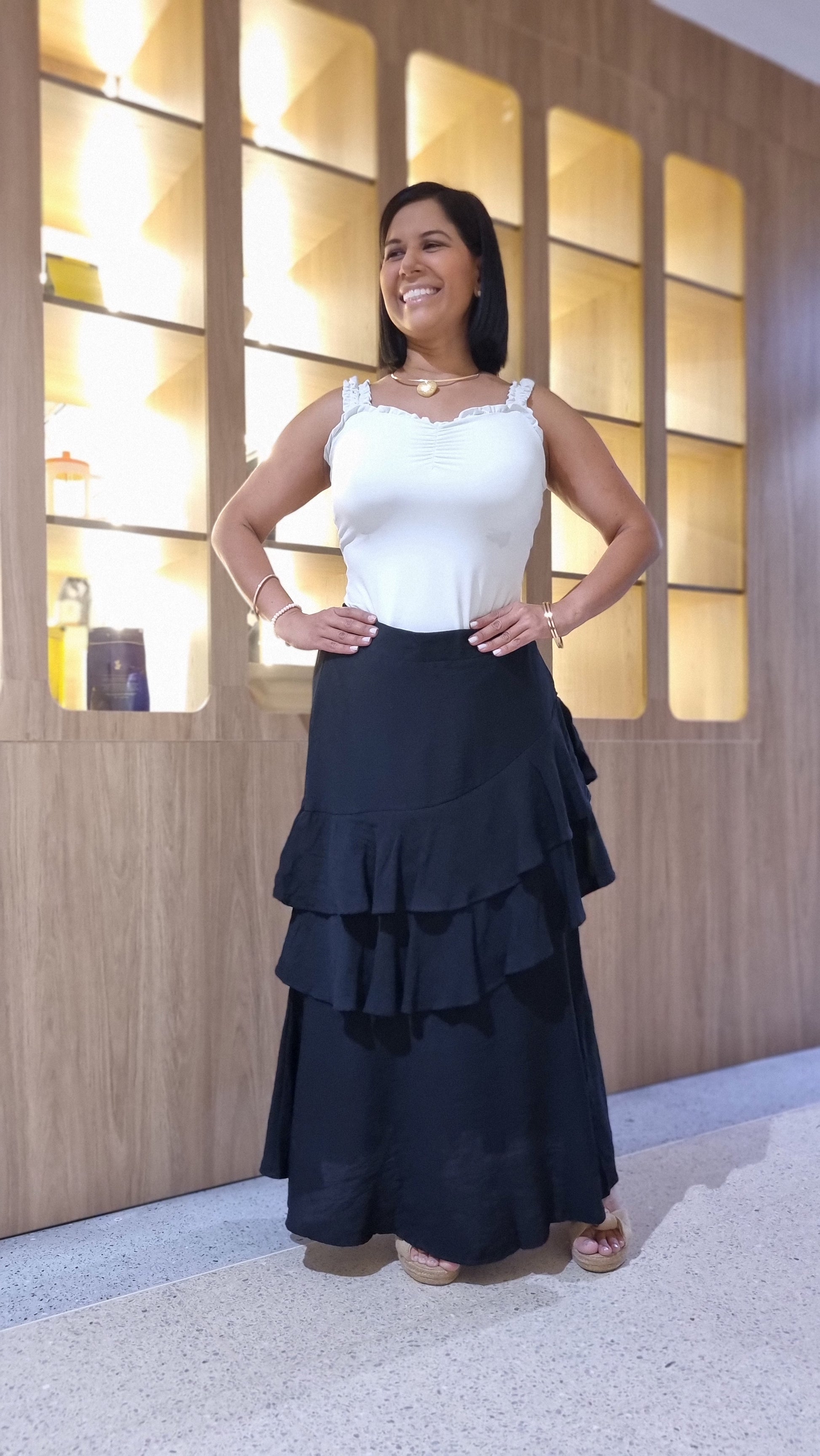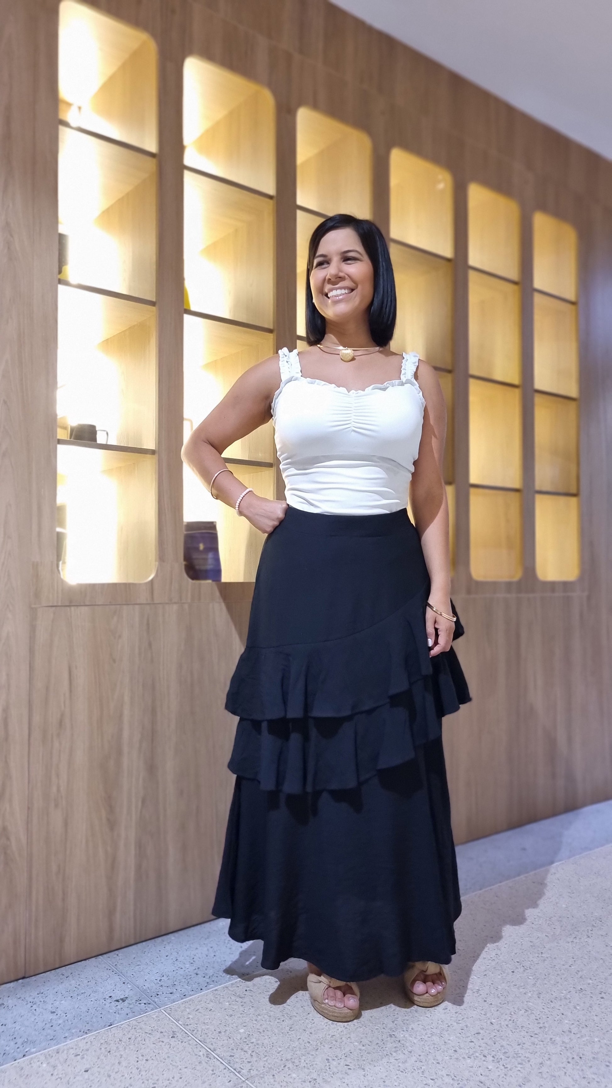 Atrévete a destacar con esta falda de boleros en color negro que combina estilo, frescura y movimiento. Confeccionada en tejido suave de rayón con nylon, Su diseño fluido y sutil hacen que sea perfecta para looks relajados con un toque atrevido. Combínala con tenis para un outfit casual chic o con sandalias para elevar tu estilo.