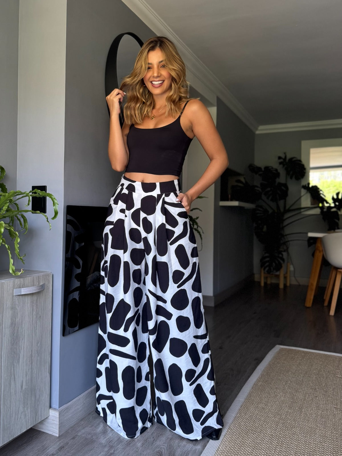 Un pantalón que destaca por su sofisticado estampado en blanco y negro, ideal para looks refinados y con mucho estilo. Su confección en rayón suave garantiza comodidad durante todo el día, mientras que el elástico en la cintura permite un ajuste perfecto, adaptándose a diferentes tipos de cuerpo. Es una prenda versátil y vestidora, perfecta para ocasiones especiales o para elevar tu outfit diario con un toque de elegancia.