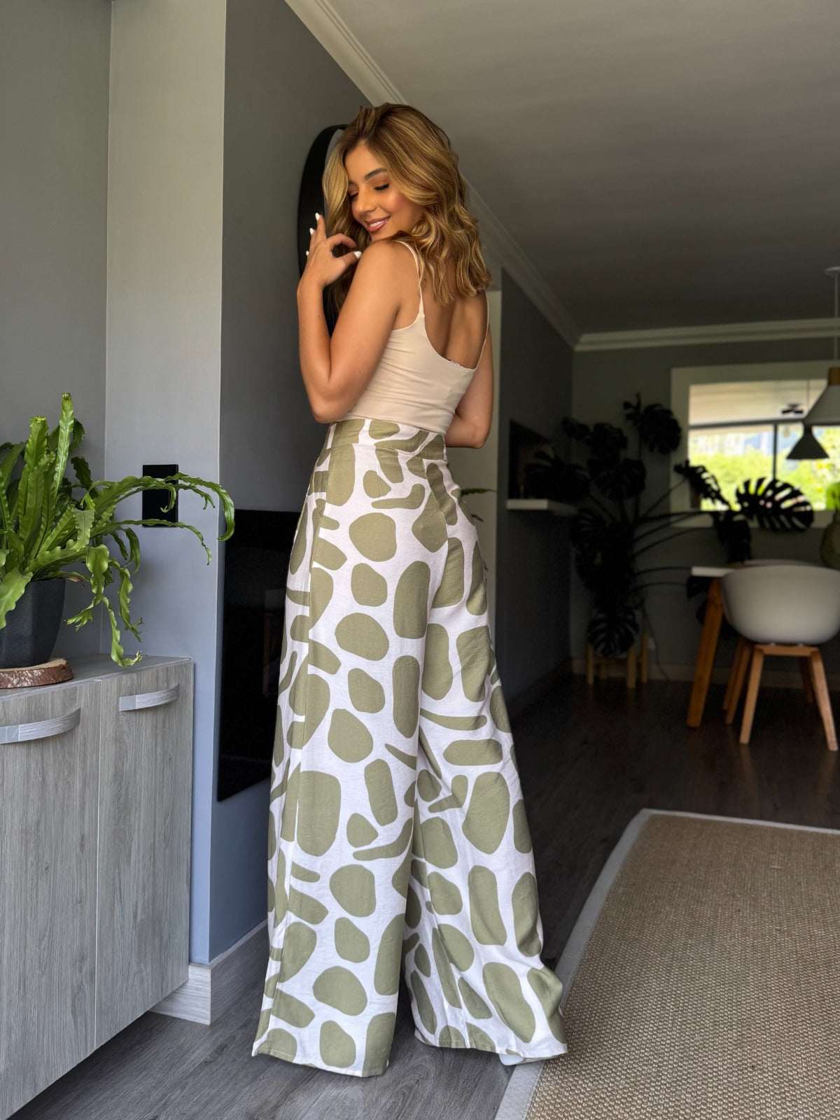 Un pantalón que destaca por su sofisticado estampado en blanco y verde, ideal para looks refinados y con mucho estilo. Su confección en rayón suave garantiza comodidad durante todo el día, mientras que el elástico en la cintura permite un ajuste perfecto, adaptándose a diferentes tipos de cuerpo. Es una prenda versátil y vestidora, perfecta para ocasiones especiales o para elevar tu outfit diario con un toque de elegancia.