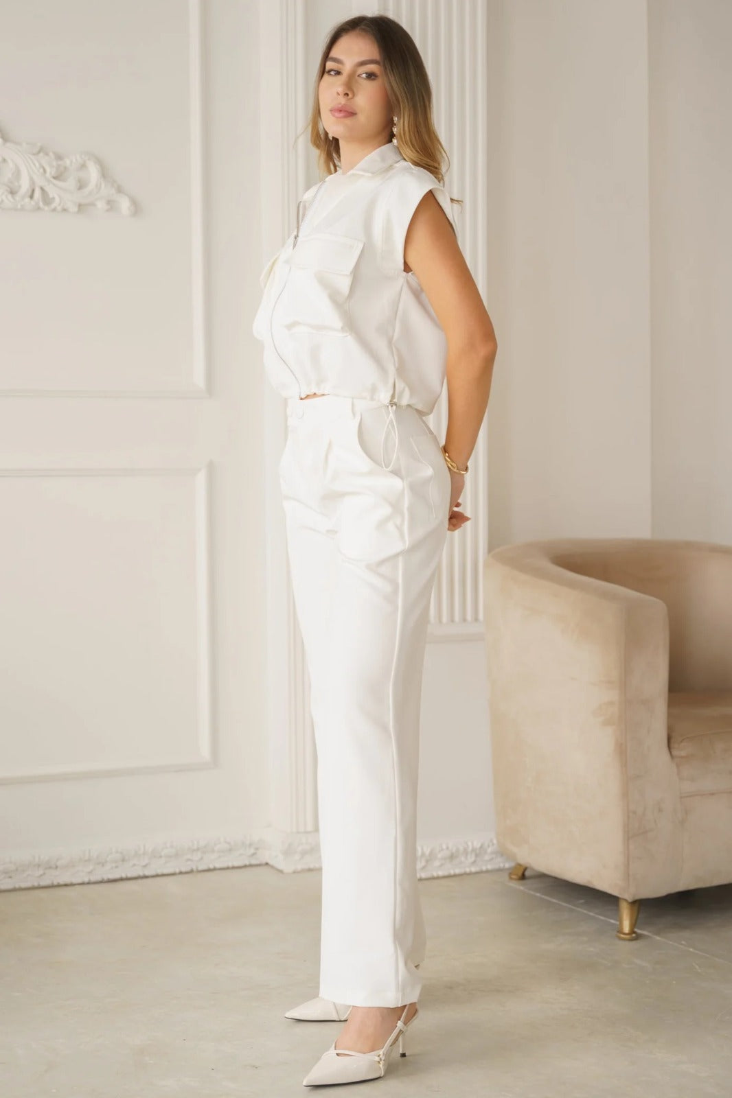 Eleva tu estilo con este sofisticado set en tono blanco, compuesto por chaleco estructurado y pantalón palazzo de corte recto. El chaleco cuenta con cierre frontal tipo cremallera, cuello camisero y bolsillos decorativos que aportan un toque moderno y chic. Su silueta ligeramente entallada realza la figura, mientras que el pantalón de tiro medio–alto y pierna amplia estiliza y alarga visualmente las piernas.