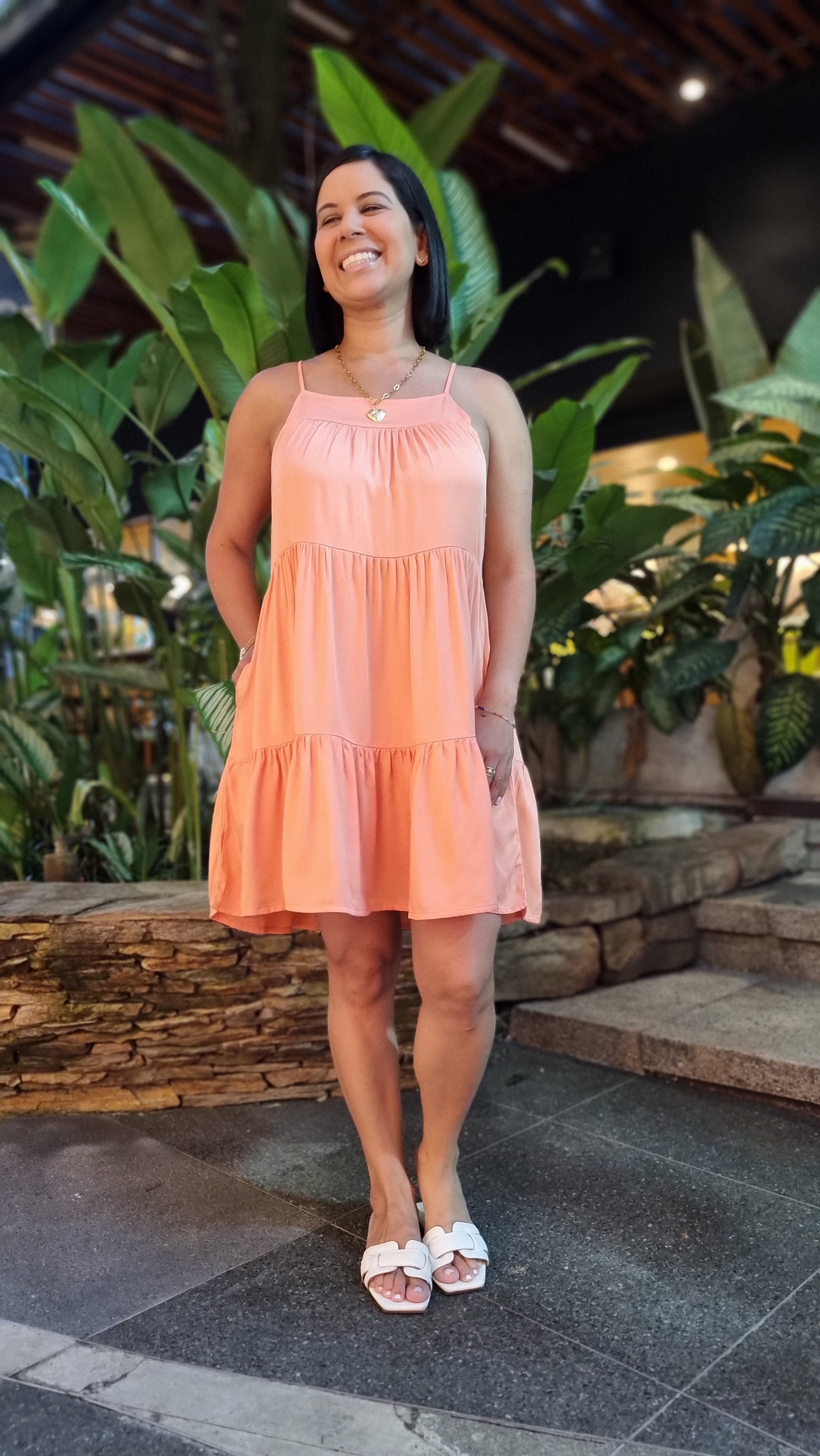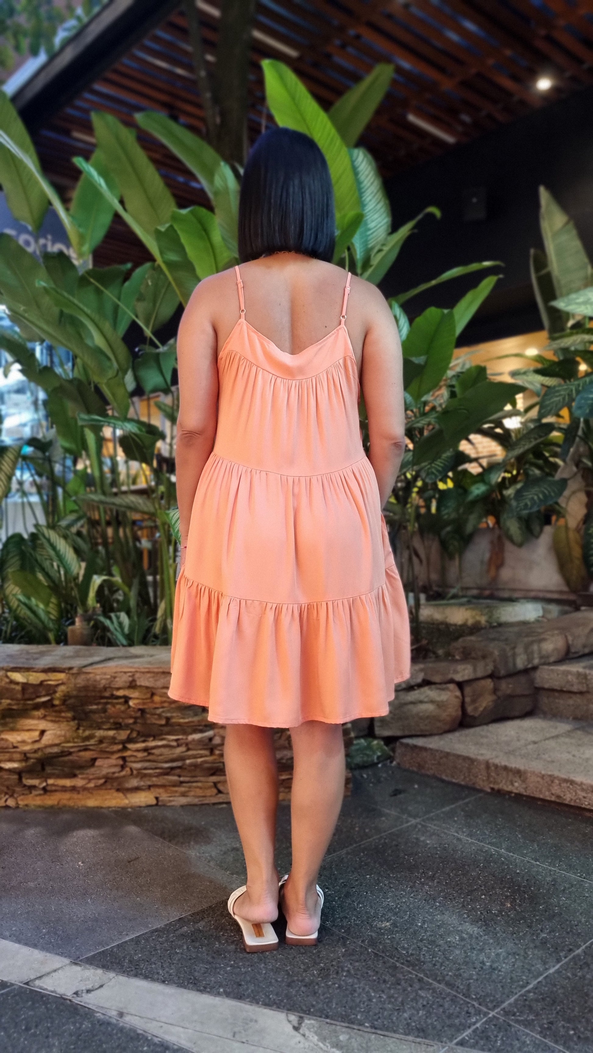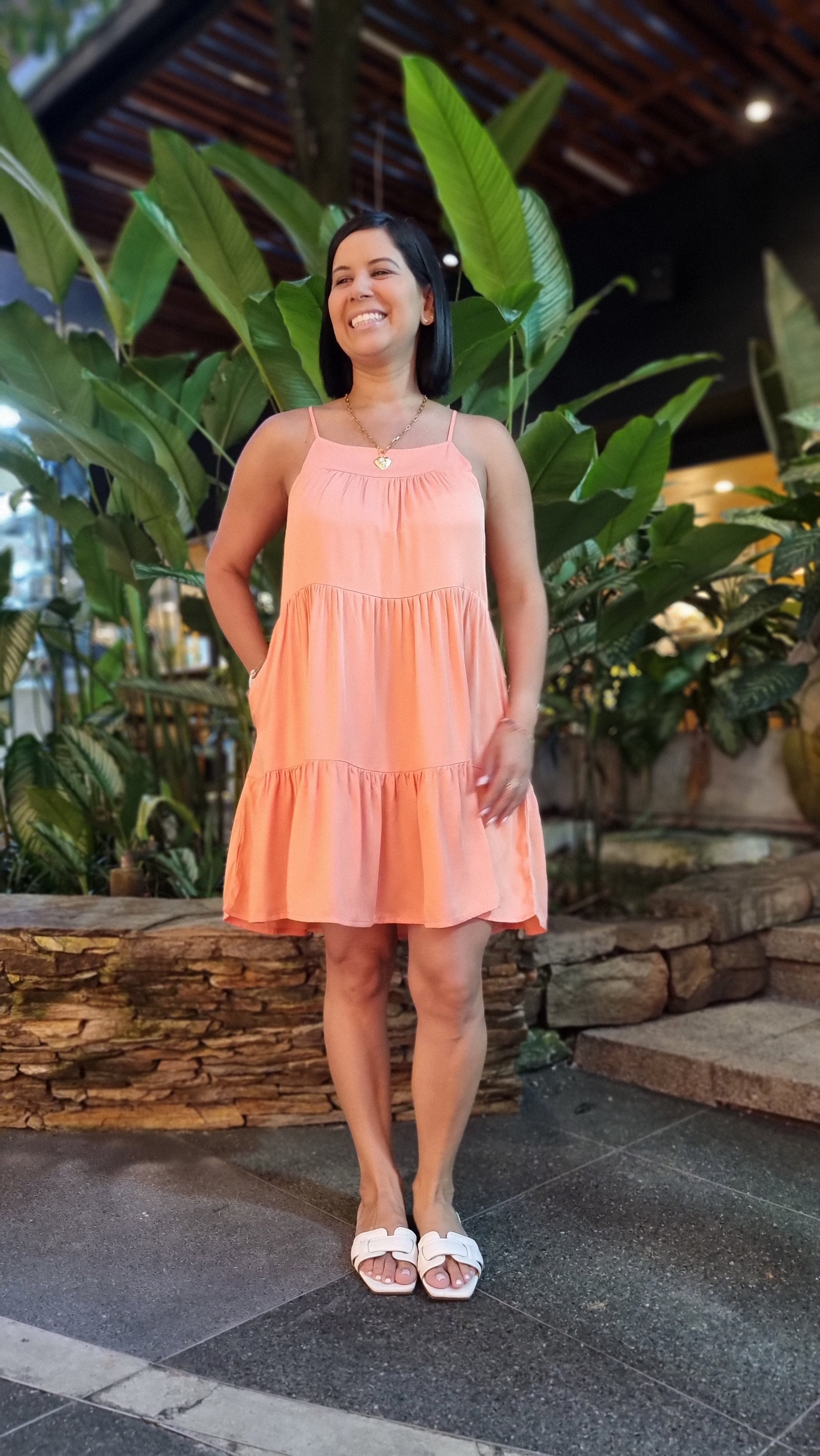 Vestido Corto en tela fresca en un color salmón irresistible. De silueta amplia con escote cuadrado, cargaderas ajustables.