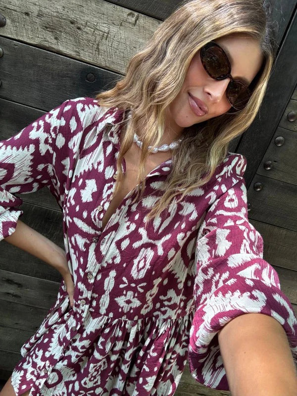 Características: Manga larga, puño resortado, botones frontales y cuello. Elaborado en chalis, silueta amplia. La modelo mide 1.72 y usa talla S.