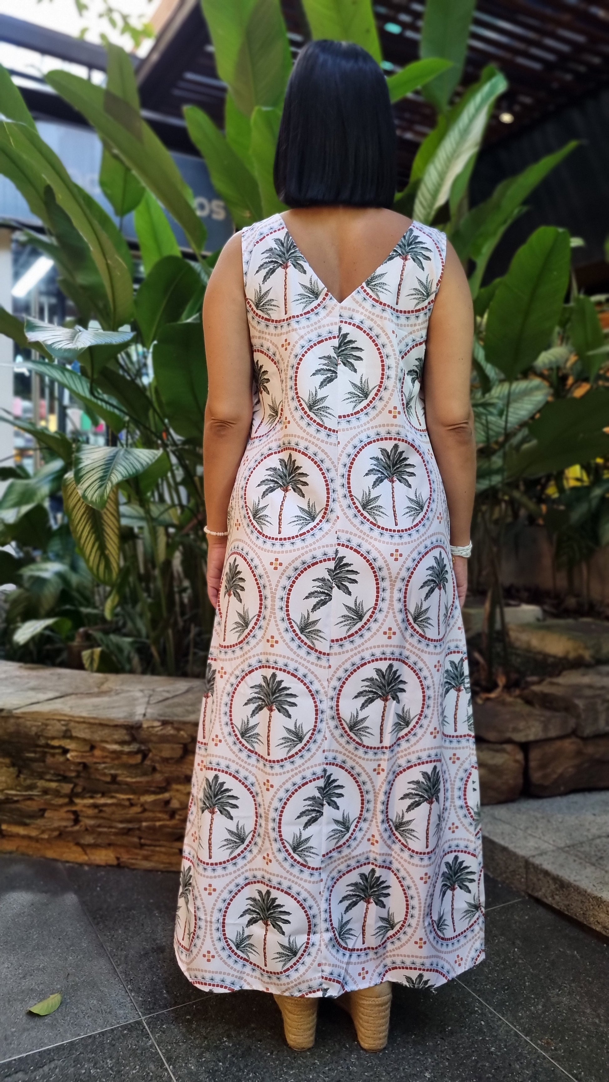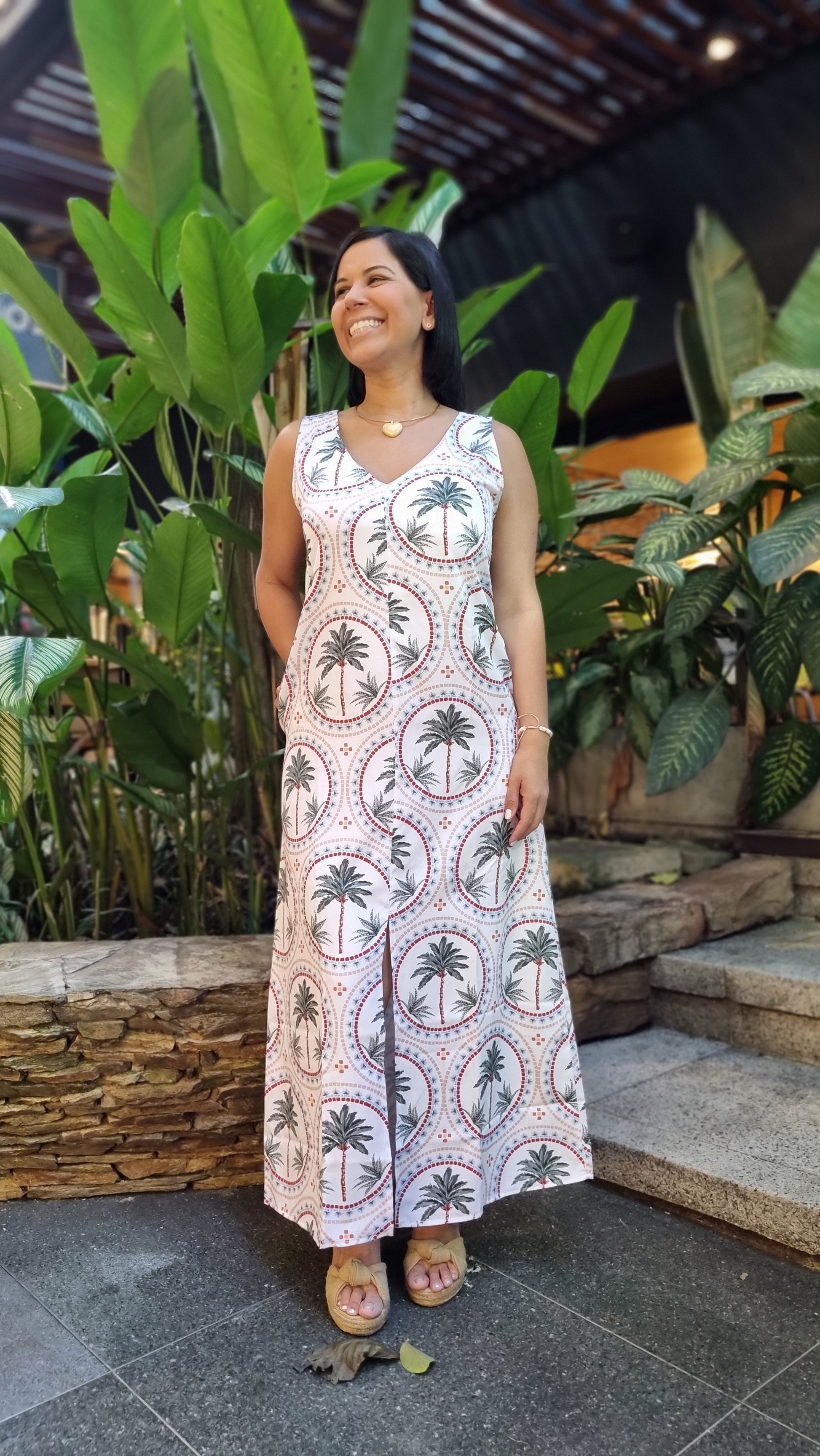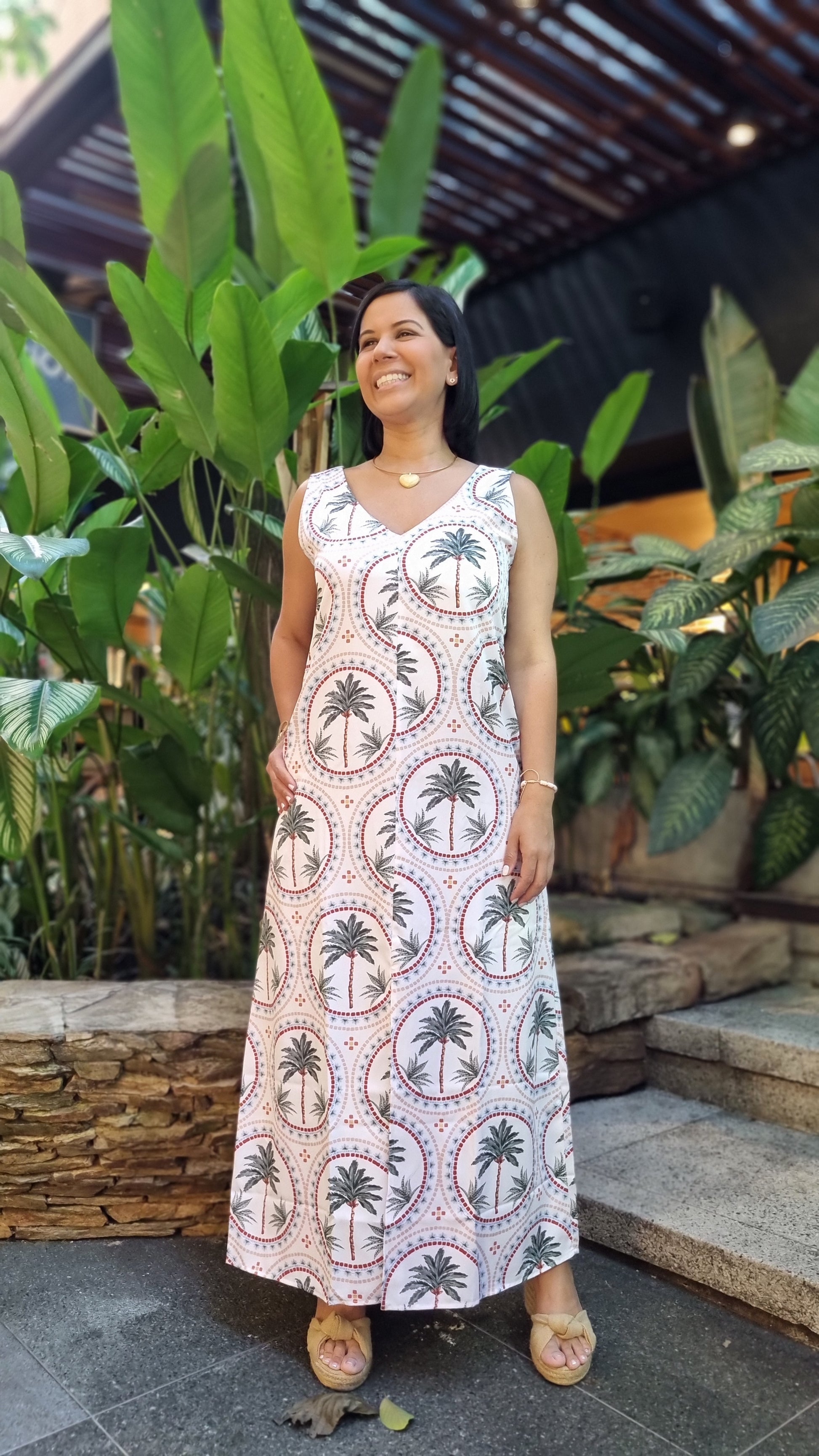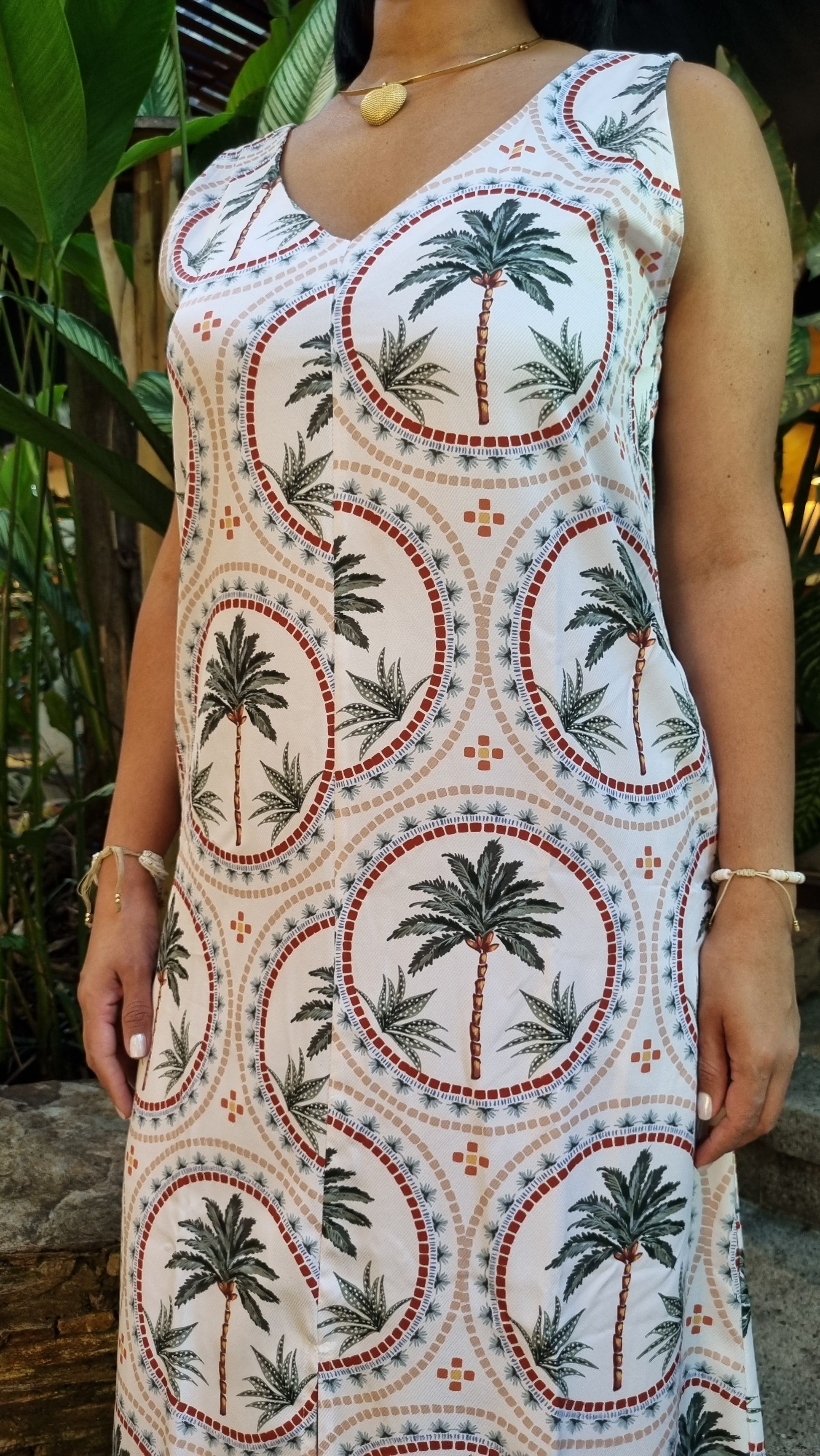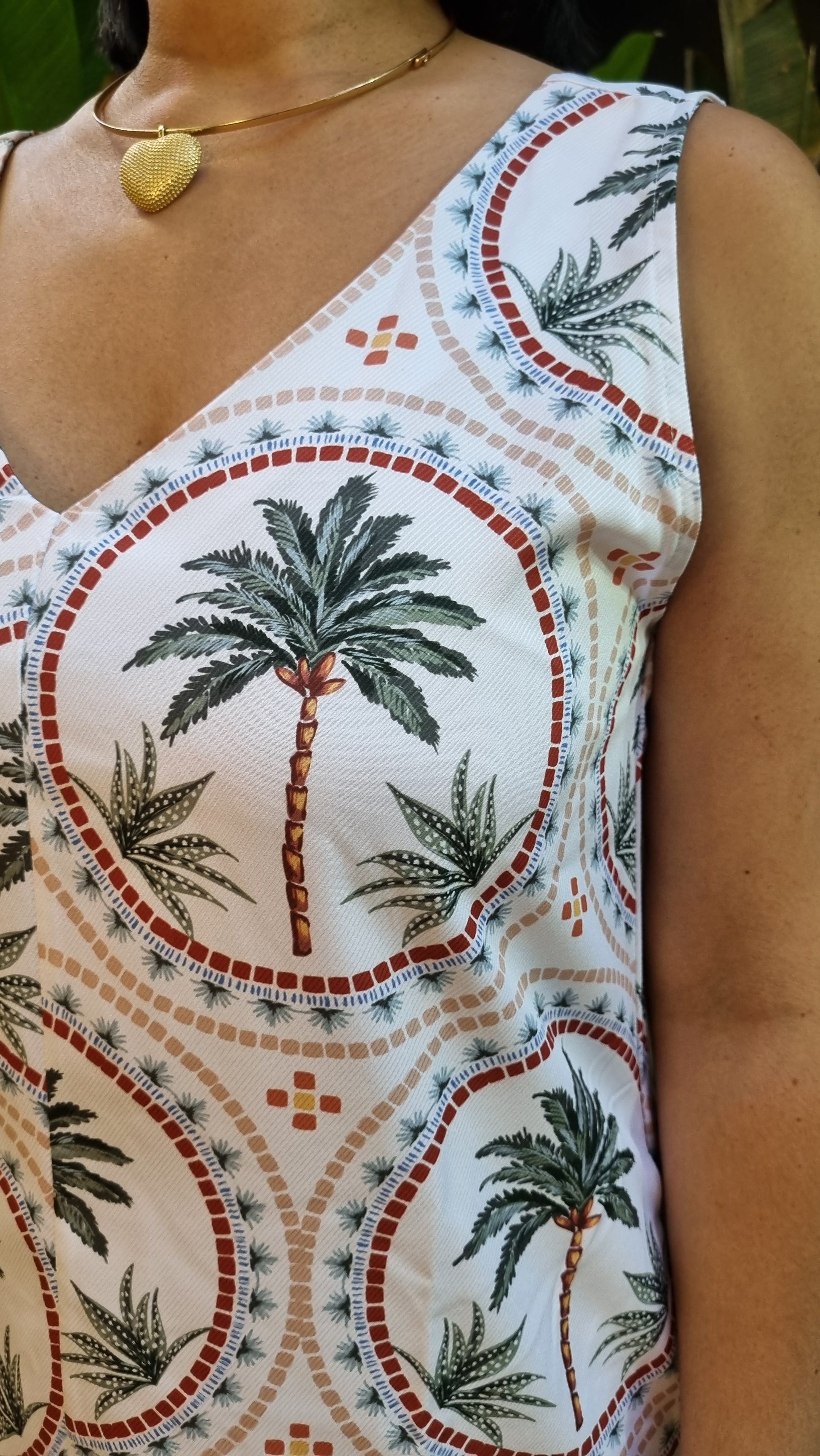 Llévate un pedacito del verano a donde vayas con este vestido de silueta relajada y estampado de palmeras. Su escote en V y caída fluida lo hacen perfecto para días cálidos, vacaciones o looks casuales con estilo.