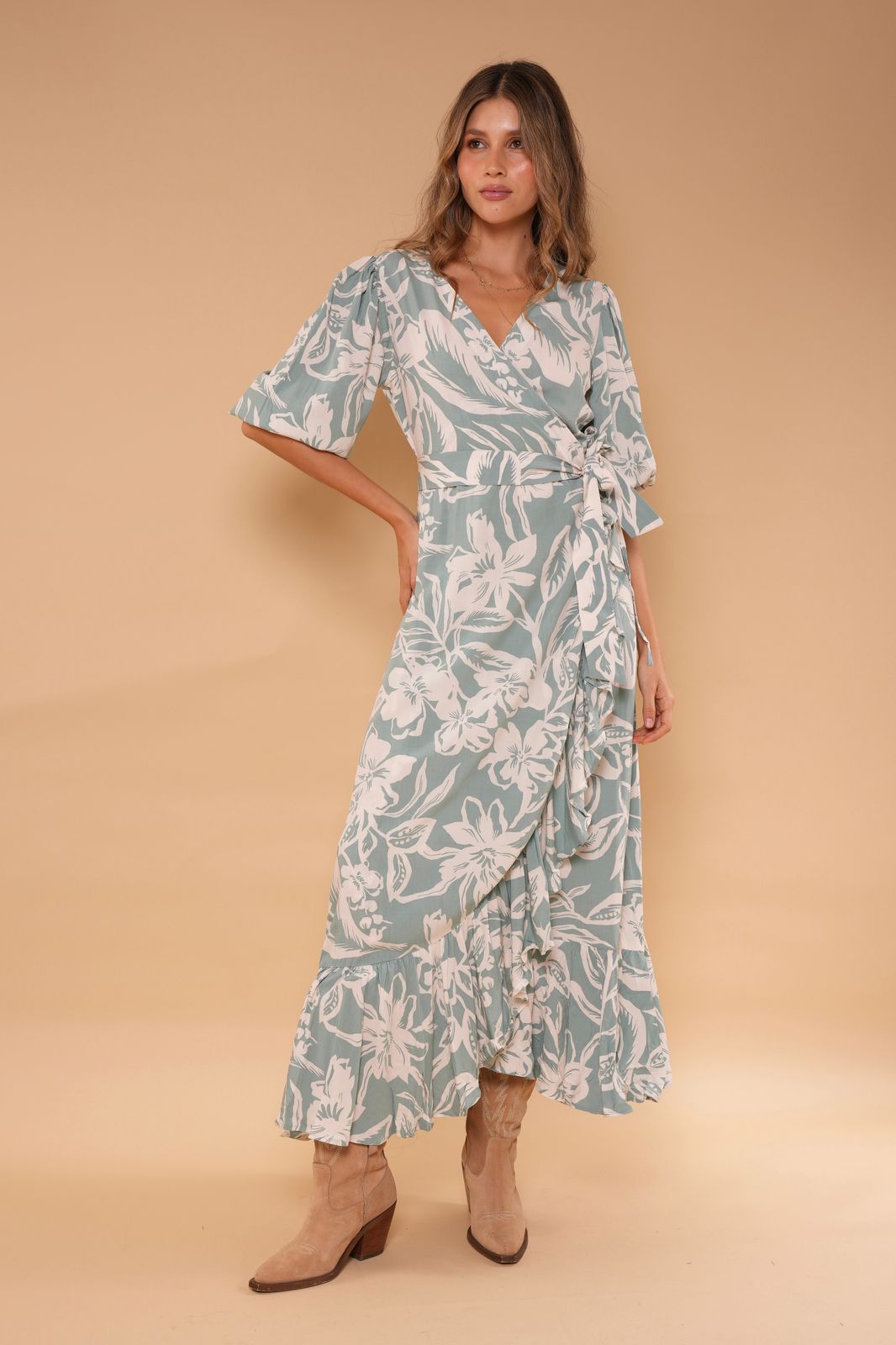 Vestido largo cruzado, diseñado para resaltar la silueta con naturalidad y movimiento. Su escote en V y manga tres cuartos aportan equilibrio y elegancia, mientras que el ajuste en la cintura permite adaptarlo cómodamente al cuerpo.