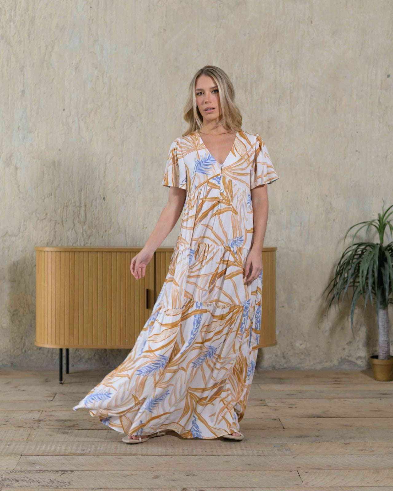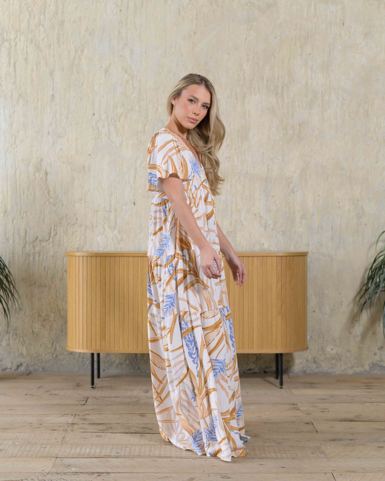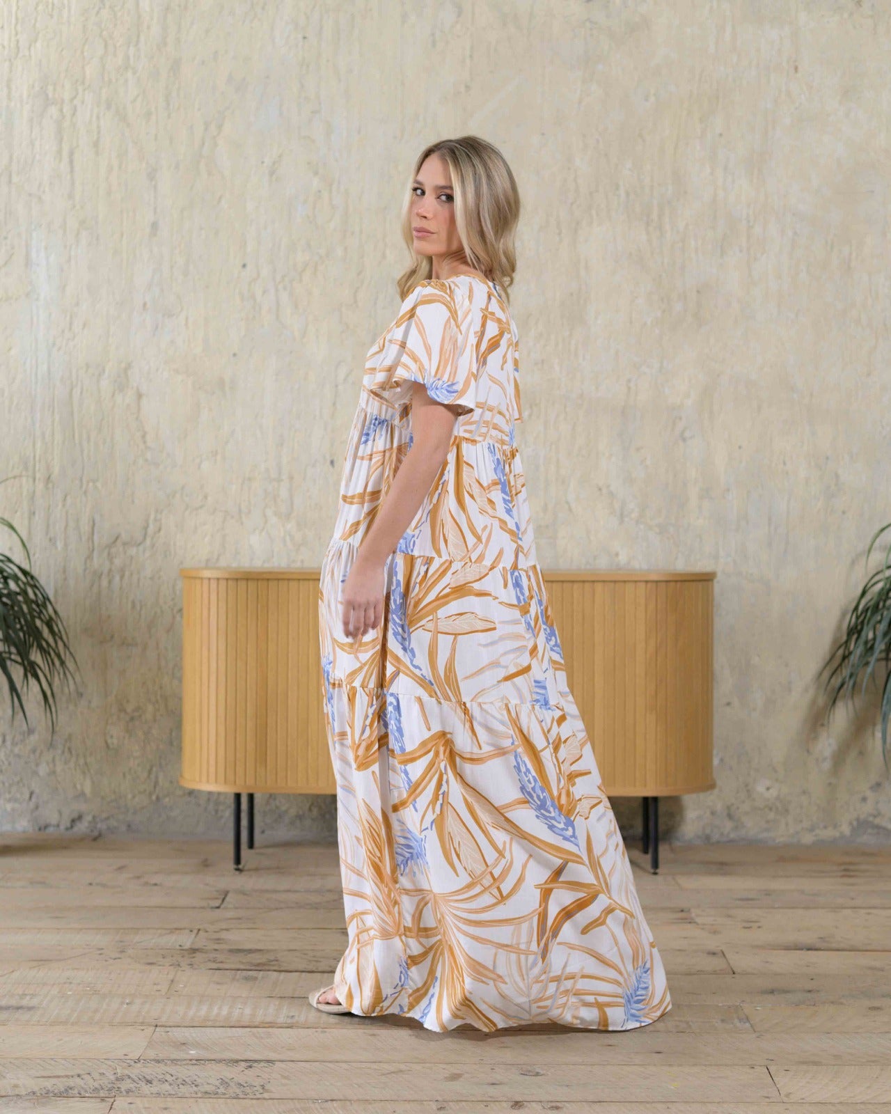 Un vestido que te hará lucir increíble. Su silueta amplia y su elegante estampado te permiten usarlo en todo momento.